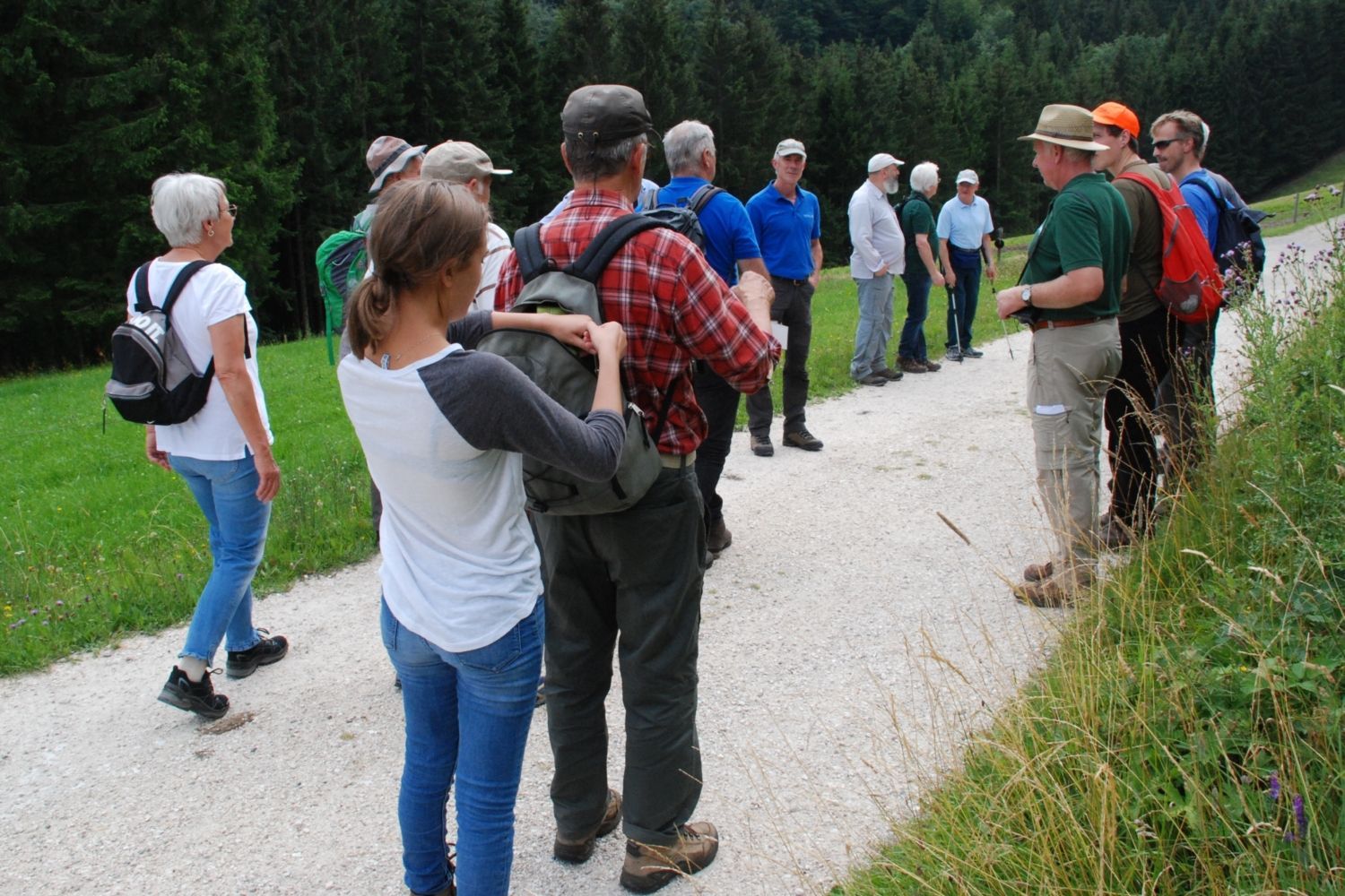 Auch an der zweiten Station der Exkursion konkurrieren Stauden und junge Bäume um den Platz an der Sonne. Herr Gambs wies auf die verschiedenen Lichtbaumarten hin, die auf dieser Fläche wachsen. Rechnet man die Blütenpflanzen und die vielen Insekten hinzu, ergibt sich der Eindruck einer hohen Artenvielfalt auf kleiner Fläche. Herr Gambs stellte aber auch heraus, dass dies nicht von Dauer sein wird. Die natürliche Entwicklung wird auf diesem Standort und der Höhenlage von ca. 850 m langfristig auf eine Buchenwaldgesellschaft mit Tanne (vereinzelt Fichte und evtl. Edellaubhölzer) hinauslaufen.. Die Lichtbaumarten wie eine Eiche würden von diesen höher wachsenden Baumarten überwachsen und in den Schatten gestellt. Eine langfristige Chance hätte die Eiche nur z.B. am Wegrand oder Waldrand oder durch ständige menschliche Eingriffe zu Lasten von Buche, Tanne, Fichte.