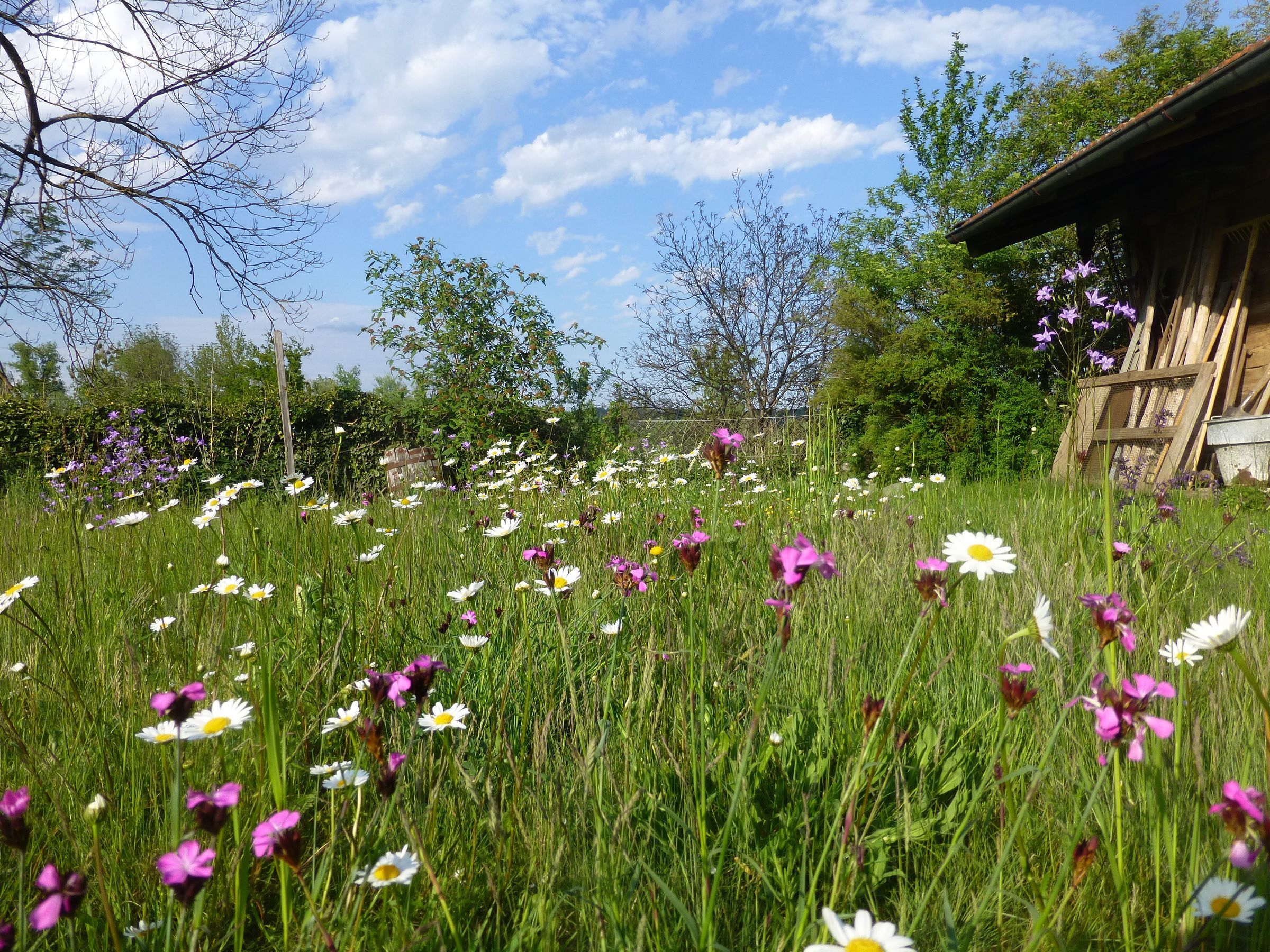 Insgesamt sollte die Fläche ca 4 Wochen feucht gehalten werden, um möglichst alle Samen zum Keimen zu bringen. Auf keinen Fall darf gedüngt werden, denn die meisten Wiesenblumen vertragen keine nährstoffreichen Böden. Danach sollten Blumenwiesen zweimal im Jahr gemäht werden, einmal Ende Juni und einmal Ende September, Anfang Oktober. Damit sich Insekten nicht nur ernähren, sondern auch fortpflanzen können, ist es zudem wichtig, für dauerhafte Strukturen im Garten zu sorgen wie Totholzhaufen, Brennesselecken oder Sandflächen. Abgeblühte Stauden können über den Winter stehen gelassen werden, denn in den Stängeln überwintern oft Insektenlarven, -puppen oder -eier. Und der Einsatz von Spritzmitteln verbietet sich natürlich im ganzen Garten!